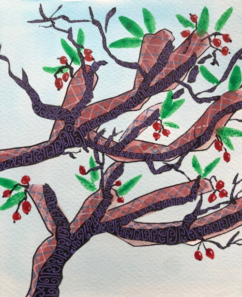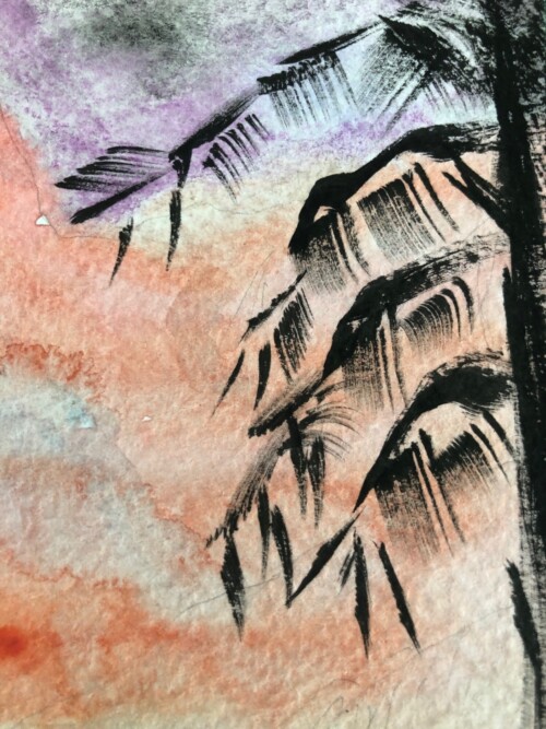 Los árboles son uno de los elementos naturales más dibujado en la historia del arte por su significado simbólico, en este caso se trata de una técnica mixta que utiliza esmalte cerámico y tinta china.